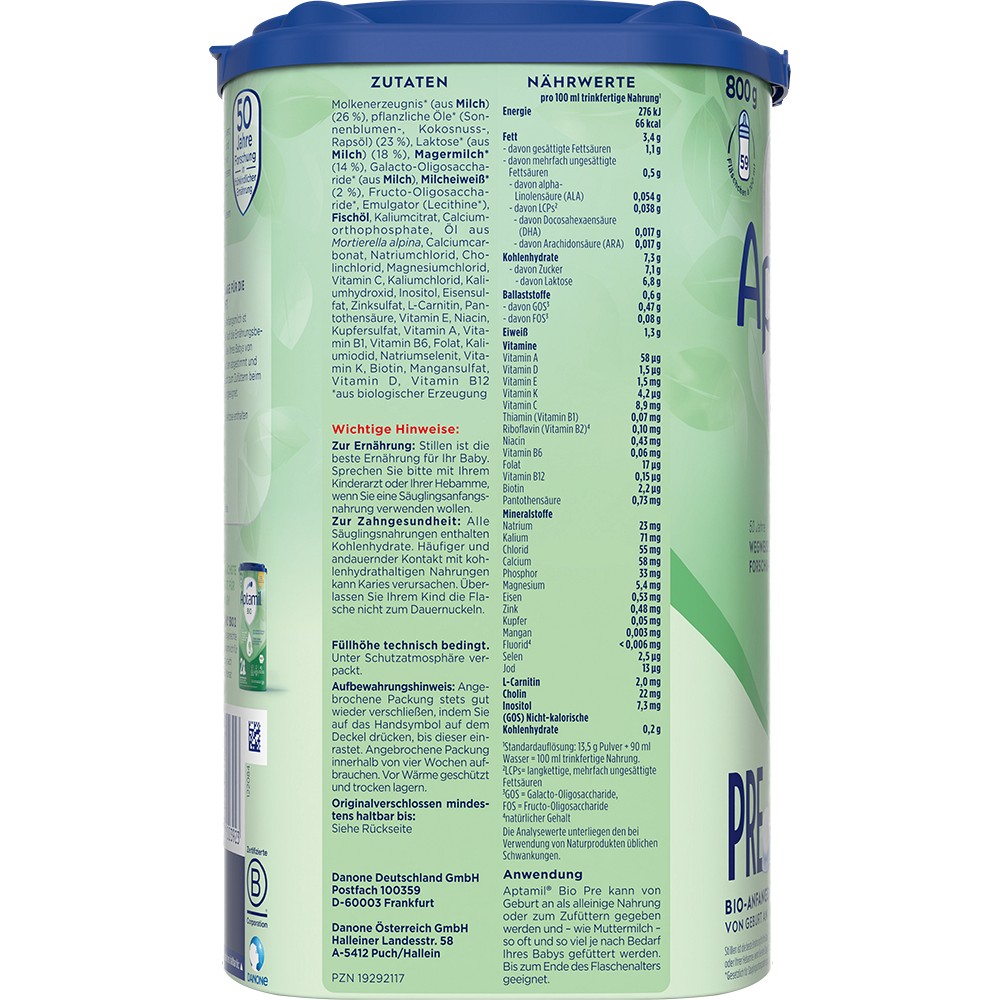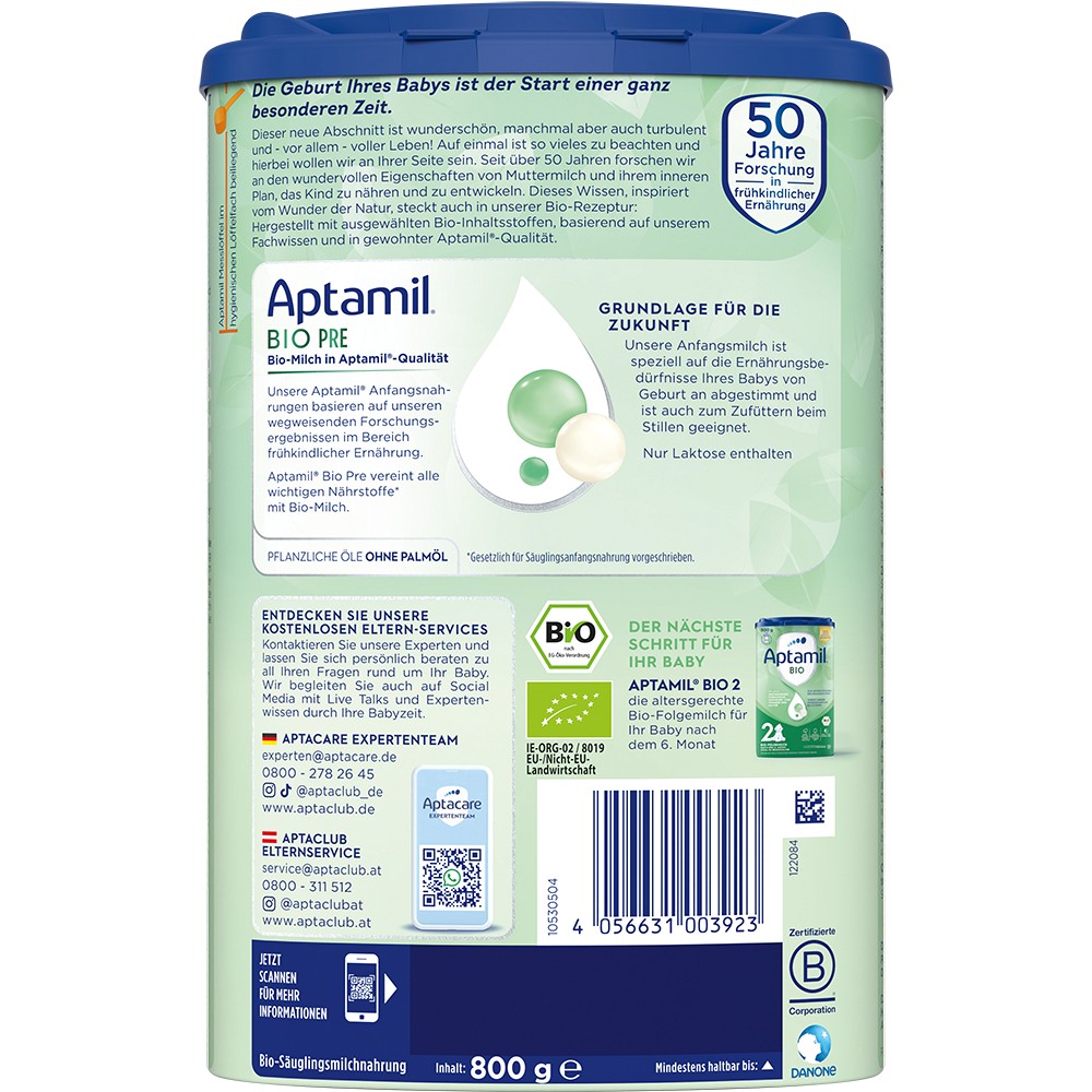 Unsere Anfangsmilch ist speziell auf die Ernährungsbedürfnisse deines Babys von Geburt an abgestimmt und ist auch zum Zufüttern beim Stillen geeignet. In Aptamil Bio Pre sind pflanzliche Öle ohne Palmöl enthalten. Die Inhaltsstoffe bleiben durch die hohen Qualitätsstandards erhalten.