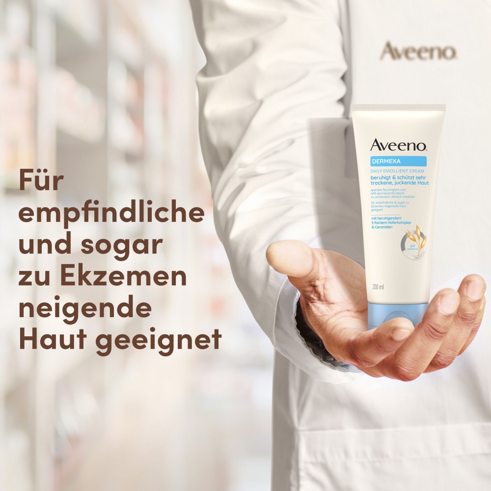 Aveeno Dermexa Feuchtigkeitsspendende Tägliche Emollientien Creme – beruhigt & schützt sehr trockene, juckende Haut. Die Körperlotion spendet Feuchtigkeit und hilft, das Hautmikrobiom zu verbessern, klinisch erwiesen. Die Hautpflege Creme ist für empfindliche und sogar zur Ekzemen neigende Haut geeignet.