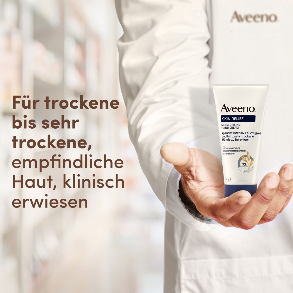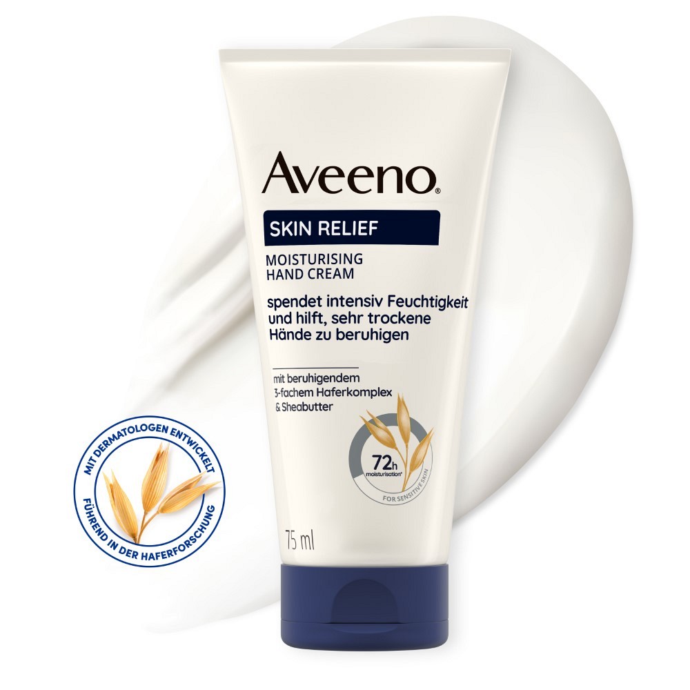 Die Aveeno Skin Relief Handcreme spendet intensiv Feuchtigkeit & hilft, sehr trockene Hände zu beruhigen. Sie erneuert & stärkt die Hautschutzbarriere, wissenschaftlich erwiesen. Die Haut wird so vor äußeren Einflüssen geschützt und unterstützt die natürliche Ceramidproduktion. Zudem beruhigt die parfümfreie Feuchtigkeitscreme mit beruhigendem 3-fachem Haferkomplex & Sheabutter die Haut, spendet intensive Feuchtigkeit und verhindert Feuchtigkeitsverlust.