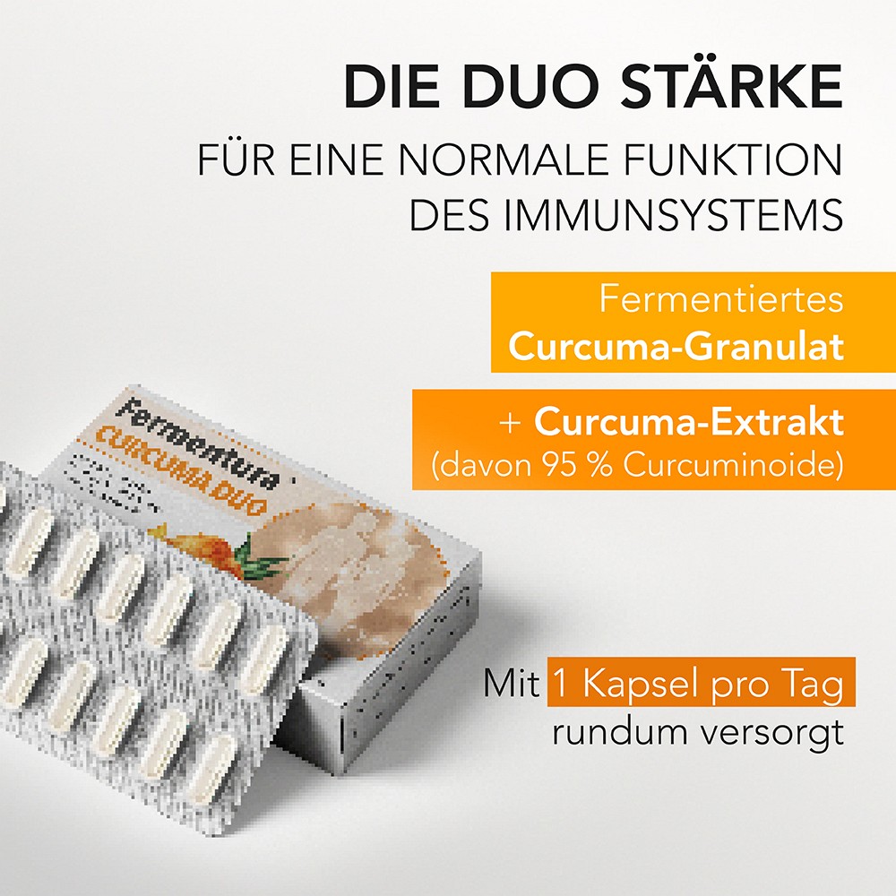 Fermentura Curcuma Duo enthält eine speziell entwickelte Rezeptur aus:- Fermentiertes Curcuma-Granulat: Curcuma enthält Curcuminoide, die antioxidative Eigenschaften besitzen.