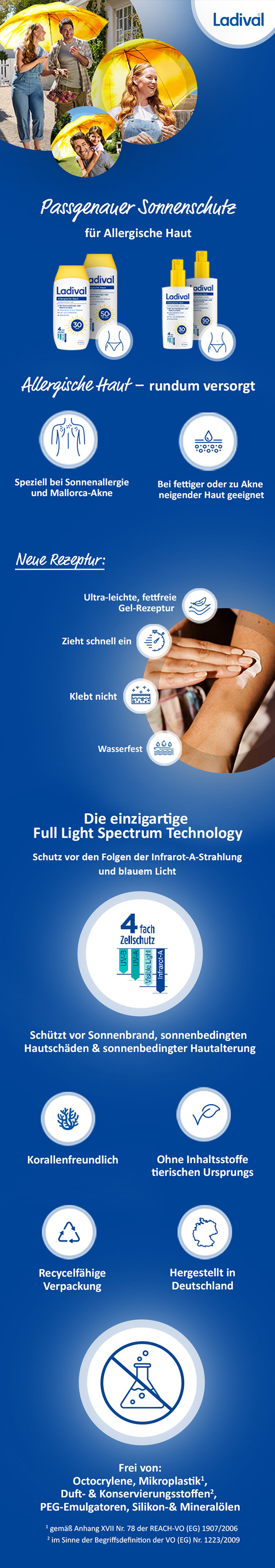 Ganzjähriger Sonnenschutz ist essenziell, da er nicht nur vor Sonnenbrand und sonnenbedingter Hautalterung schützt, sondern auch das Risiko an Hautkrebs zu erkranken reduziert. Um Menschen mit allergischer Haut optimal zu versorgen, bietet Ladival die Allergische Haut-Serie an. Diese wurde speziell für Haut entwickelt, die zu Sonnenallergie (polymorphe Lichtdermatose/PLD) und Mallorca-Akne neigt.PRODUKTPROFIL
