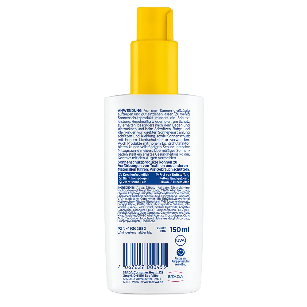 Dank der leichten, fett- und emulgatorfreien Rezeptur zieht das Sonnenschutz-Spray schnell ein, klebt nicht und hinterlässt keine Rückstände. Zudem ist es wasserfest und korallenfreundlich, was es zum idealen Begleiter für den nächsten Urlaub macht. Die Verpackung ist recycelbar (muss nicht getrennt entsorgt werden) und schützt somit nicht nur die Haut, sondern trägt auch zur Nachhaltigkeit bei.ANWENDUNGSEMPFEHLUNG