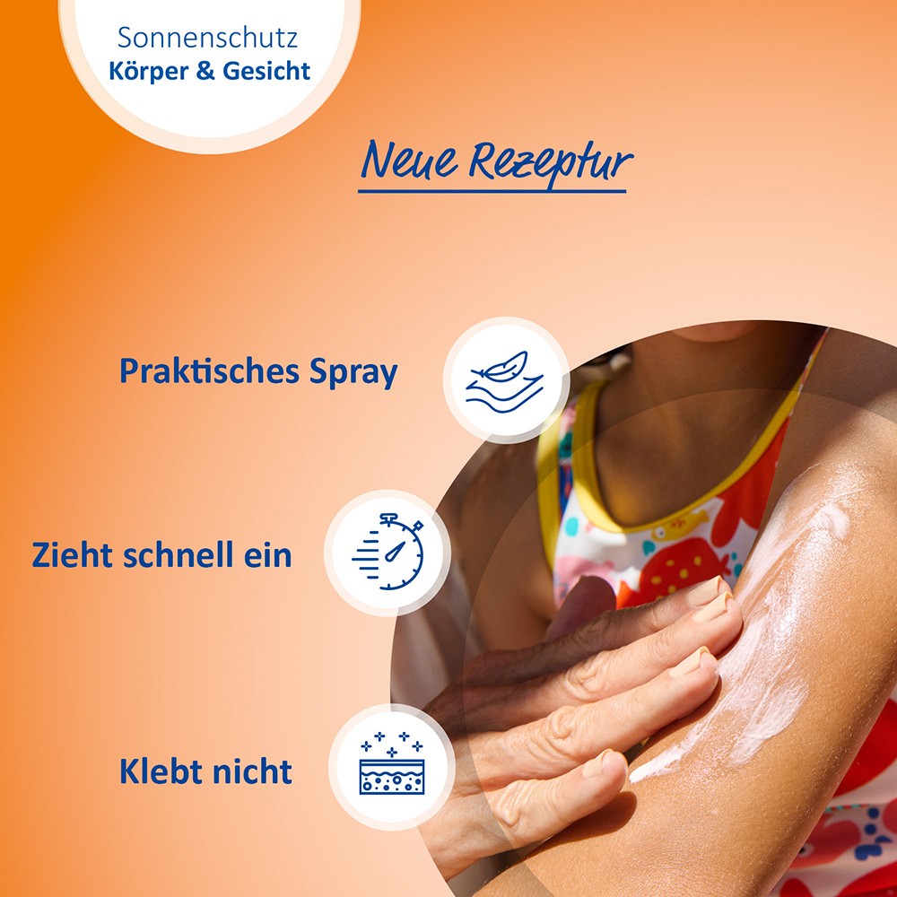 Die reichhaltige Öl-in-Wasser Emulsion spendet Feuchtigkeit und pflegt mit Dexpanthenol. Das Spray ist für Baby- und Kinderhaut ab 6 Monaten sowie zu Neurodermitis neigender Haut geeignet und brennt nicht in den Augen. Zudem ist es extra wasserfest und korallenfreundlich, was sie zum idealen Begleiter für den nächsten Urlaub macht.Die Verpackung ist recycelbar (muss nicht getrennt entsorgt werden) und schützt somit nicht nur die Haut, sondern trägt auch zur Nachhaltigkeit bei.