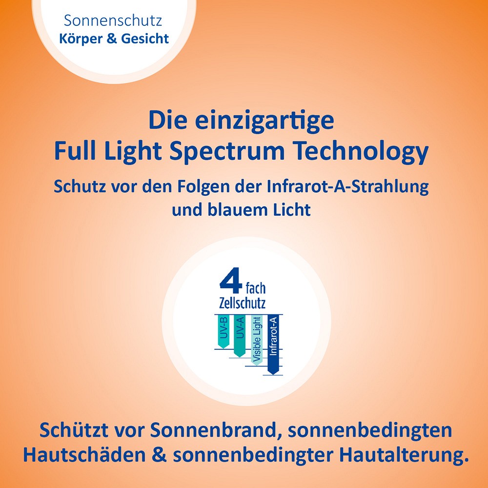 Sonnenstrahlen gibt es in verschiedenen Wellenlängen. Sie haben verschiedene Auswirkungen auf die Haut, wirken jedoch alle zellschädigend. Daher ist es wichtig einen Sonnenschutz zu verwenden, der rundum schützt.Dank einzigartigem 4-fach Zellschutz schützt das Ladival Empfindliche Kinderhaut Sonnenschutz-Spray vor UV-A- und UV-B-Strahlen, vor den Folgen der Infrarot-A-Strahlung und sichtbarem Licht (einschließlich blauem Licht).