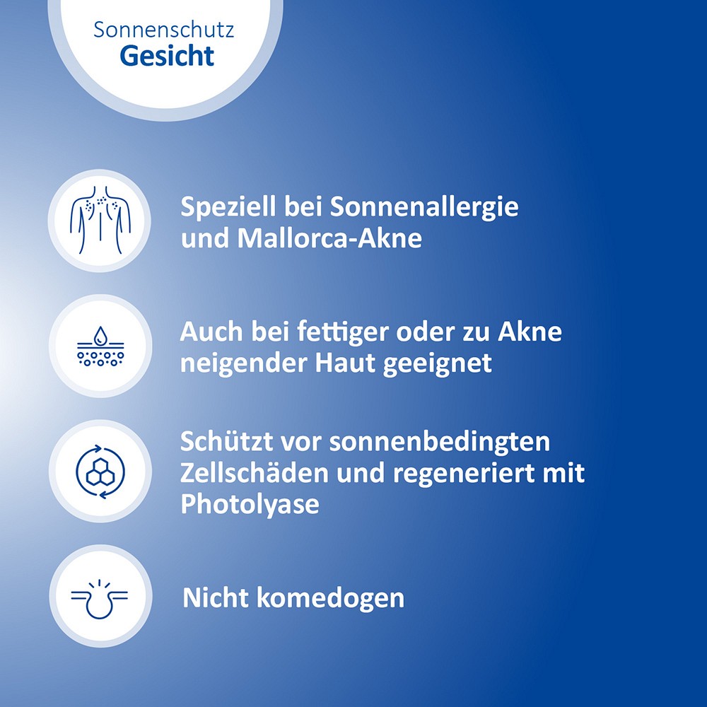 Dank seiner ultra-leichten, fett- und emulgatorfreienfreien Rezeptur zieht das Sonnenschutz-Gel schnell ein und bietet eine ideale Grundlage für Make-Up. Es schützt nicht nur effektiv vor sonnenbedingten Zellschäden, sondern unterstützt die Haut auch aktiv bei der Regeneration durch Photolyase.Die nicht komedogene Rezeptur legt sich sanft und schützend auf die Haut, ohne Augenreizungen, Pilling-Effekte (Klumpen des Produktes auf der Haut) oder weiße Rückstände zu hinterlassen – so ist das Sonnenschutz-Gel der perfekte Begleiter im Alltag.