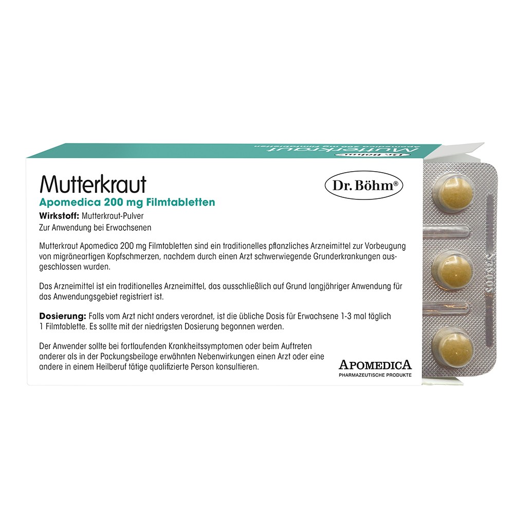 Mutterkraut Apomedica 200 mg Filmtabletten ist ein traditionelles pflanzliches Arzneimittel zur Vorbeugung von migräneartigen Kopfschmerzen (Migränekopfschmerz).