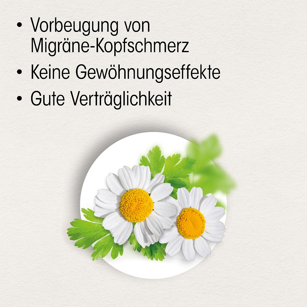 Das pflanzliche Arzneimittel enthält reines Mutterkraut – eine Heilpflanze, die nachweislich die Anfallshäufigkeit bei Migräne reduziert – in der aktuell höchsten zugelassenen Dosierung (200 mg). Bereits ab einer Filmtablette täglich beugen Sie Migränekopfschmerz langfristig vor.