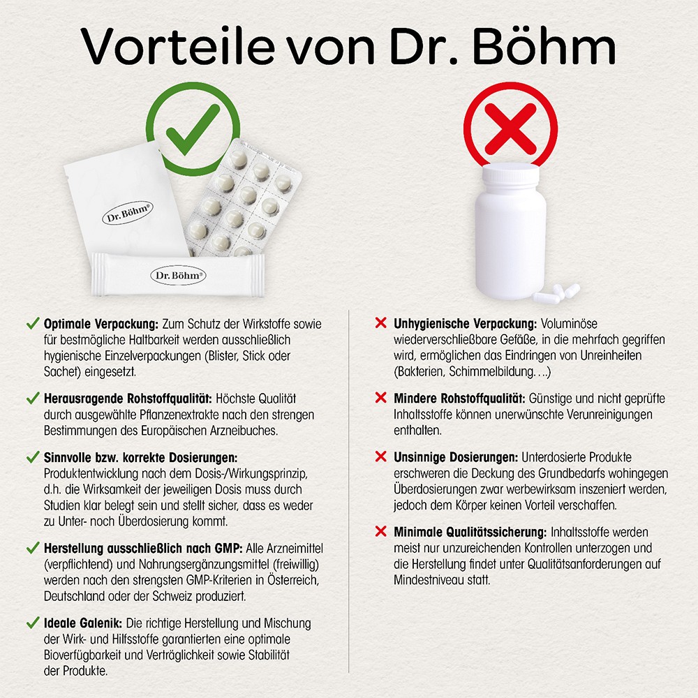 Dr. Böhm verbindet die geballte Kraft der Natur mit aktuellen wissenschaftlichen Erkenntnissen. So entstehen hochwirksame Produkte, die mit optimal aufeinander abgestimmten Inhaltsstoffen ganz Ihrer Gesundheit gewidmet sind. Sowohl Arznei- als auch Nahrungsergänzungsmittel von Dr. Böhm werden nach höchsten pharmazeutischen Standards produziert.