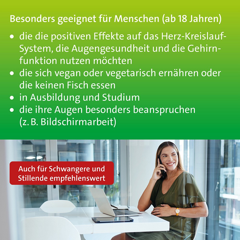 Nicht geeignet für Kinder und Jugendliche. Zutaten: DHA- und EPA-reiches Öl aus der Mikroalge Schizochytrium sp., Feuchthaltemittel Glycerin, modifizierte Maisstärke, Verdickungsmittel Carrageen, Sonnenblumenöl, Antioxidationsmittel (Extrakt aus Rosmarin, stark tocopherolhaltige Extrakte, Fettsäureester der Ascorbinsäure). Packungsgröße: 60 Kapseln.