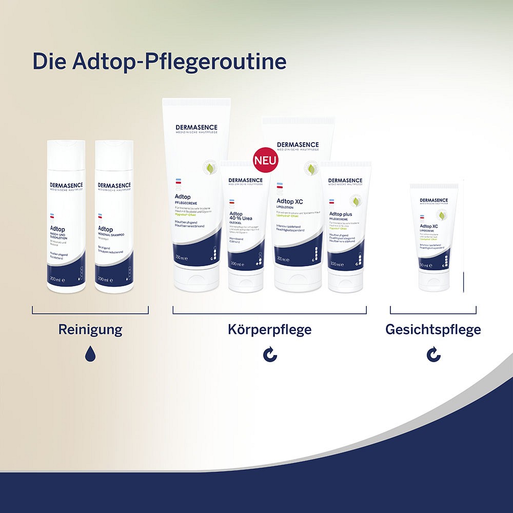 Täglich morgens und abends nach der Reinigung auftragen und leicht einmassieren.Zur sanften Reinigung DERMASENCE Adtop Wasch- und Duschlotion und zur Pflege extrem trockener Haut am Körper DERMASENCE Adtop XC Lipidlotion verwenden.