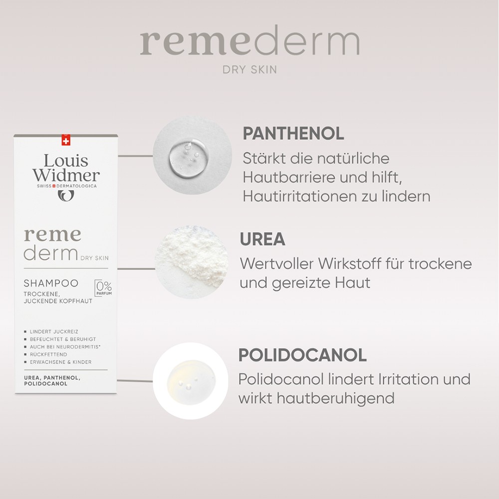 Remederm Shampoo wird auf das nasse Haar aufgetragen und leicht einmassiert. Kurz einwirken lassen und anschliessend sorgfältig ausspülen. Bei Bedarf Vorgang wiederholen. Dank der milden Grundlage ist tägliches Haarewaschen möglich.