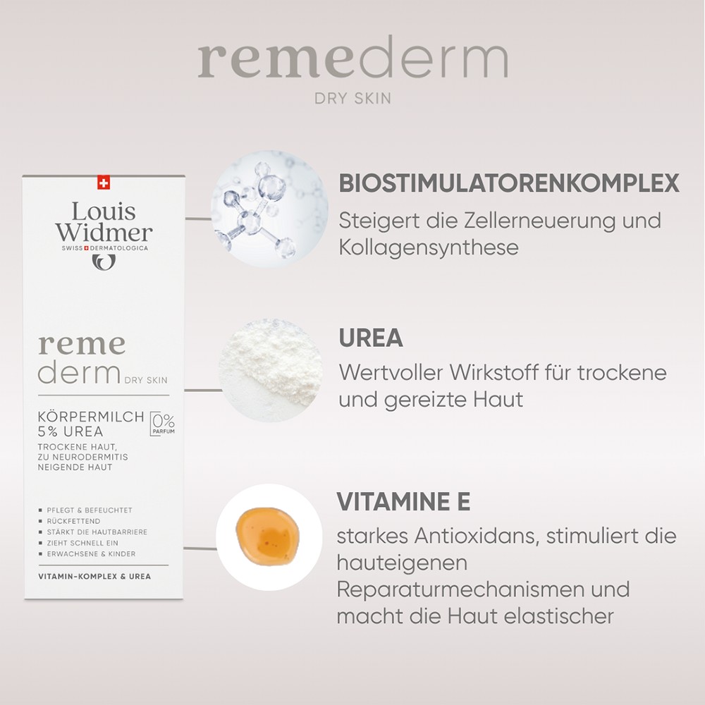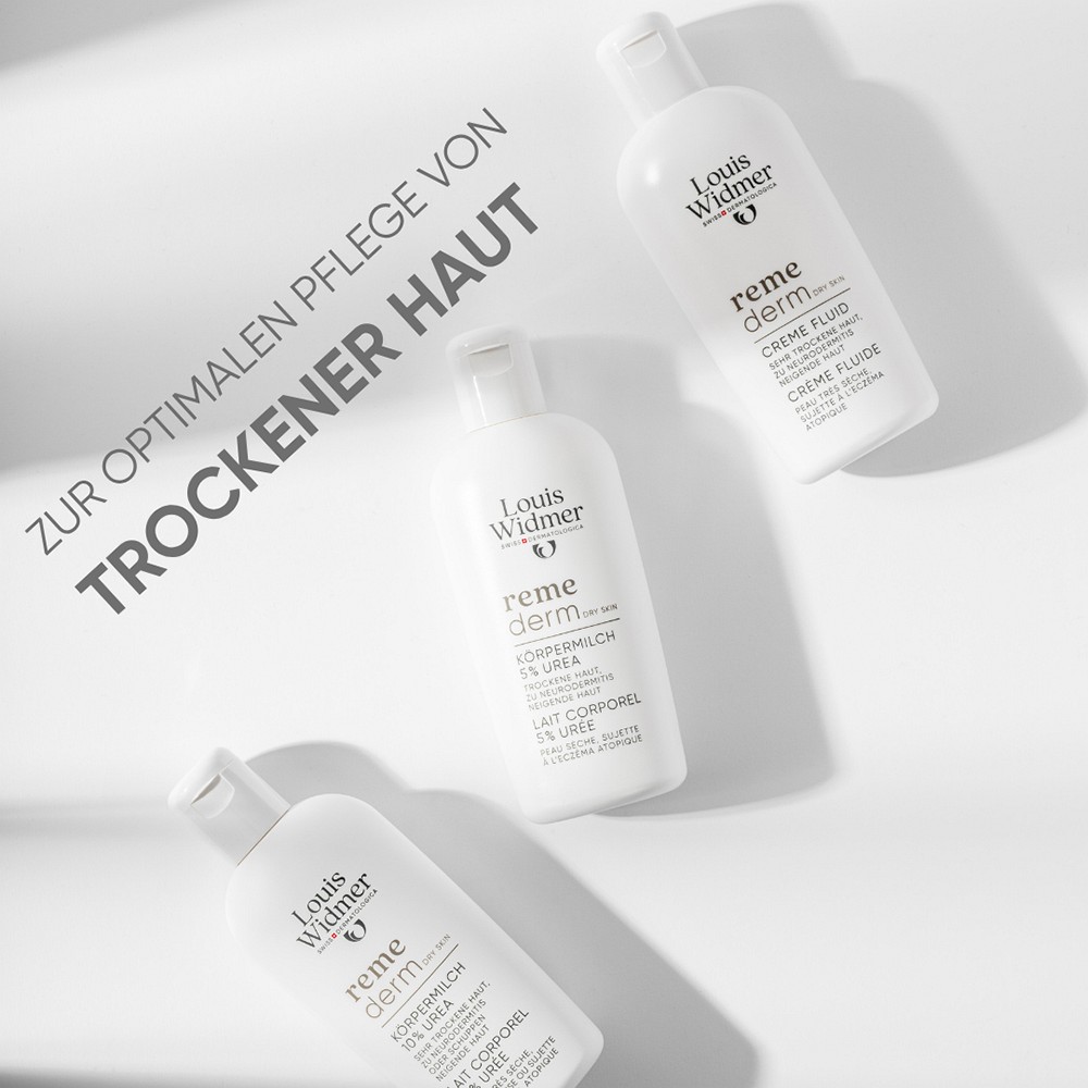 Ein- bis zweimal täglich eincremen. Bei Bedarf kann mit remederm Creme Fluid abgewechselt werden, z.B. je nach Jahreszeit.Wirkstoffe: