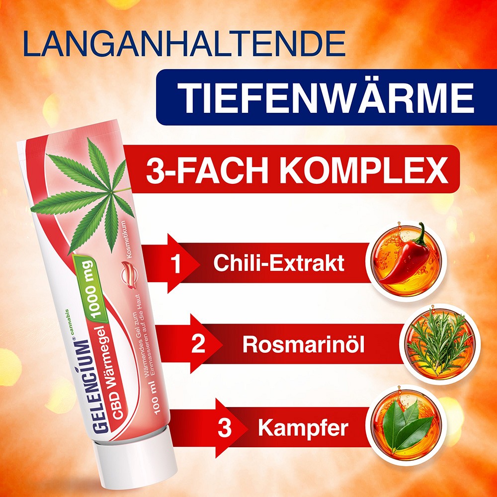 Das neue GELENCIUM Cannabis CBD Wärmegel 1000 mg der führenden Arthrose-Apothekenmarke GELENCIUM ist ein extra-hochdosiertes CBD Gel (1000 mg CBD pro Tube) mit langanhaltender Tiefenwärme für Muskeln und Gelenke.