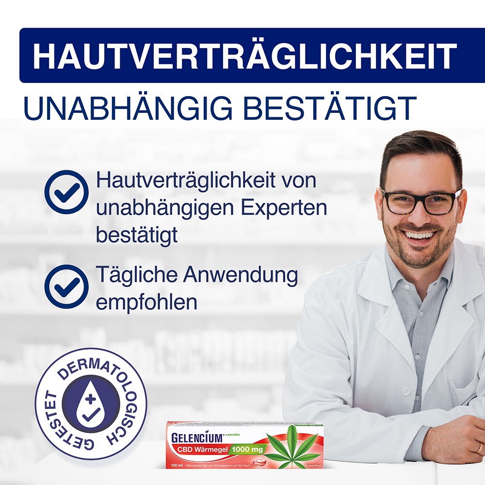 - GELENCIUM CBD Wärmegel 1000 mg ist ein geprüftes und dermatologisch getestetes Kosmetikum.