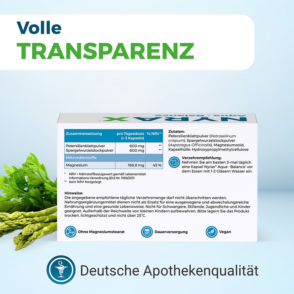 NYRAX Aqua Balance ist ein hochwertiger Phytokomplex mit Magnesium und unterstützt das Elektrolytgleichgewicht während Entwässerungskuren1- Premium-Phytokomplex in Apothekenqualität