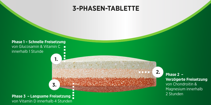 Hinzu kommen Vitamin C, das zur normalen Kollagenbildung für eine normale Funktion von Knorpel beiträgt, und Vitamin D, welches zur Erhaltung normaler Knochen beiträgt.