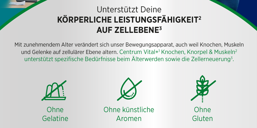 Unterstütze Deine körperliche Leistungsfähigkeit und Deinen Bewegungsapparat bestmöglich – vertraue auf die bewährte Qualität von Centrum, die sich auf über 40 Jahre Forschungserfahrung stützt. Dein Leben. Deine Wahl. Dein Centrum Vital1+ Knochen, Knorpel & Muskeln2.