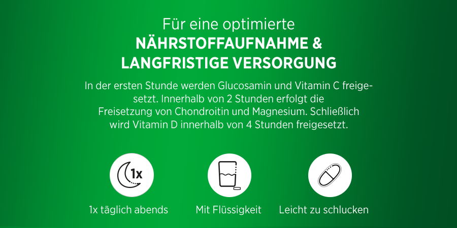 Die darin enthaltenen Mikronährstoffe tragen zur Unterstützung wichtiger Funktionen des Bewegungsapparates bei. Unser Nährstoffkomplex enthält Glucosamin und Chondroitin, welche natürliche Bestandteile des Knorpelgewebes sind.