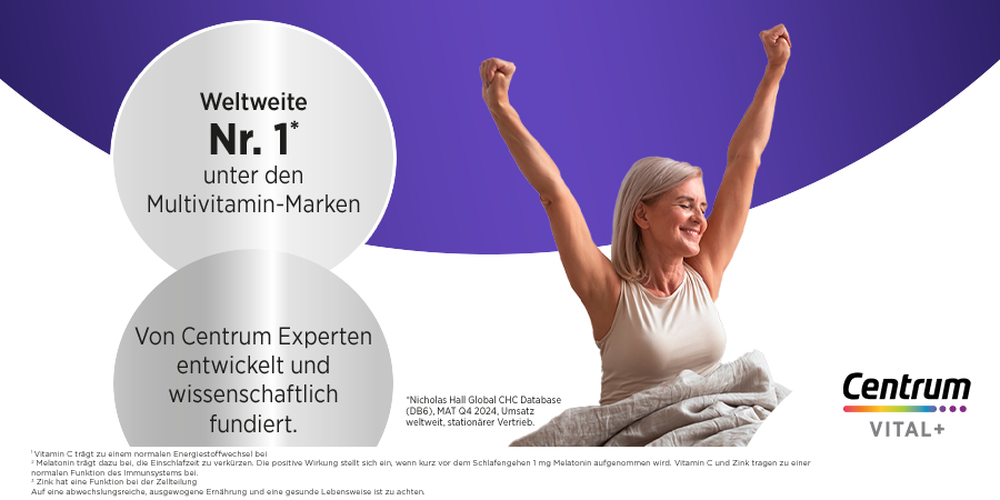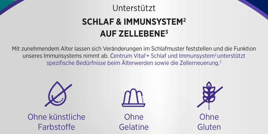 Außerdem nimmt im Alter die Funktion des Immunsystems ab. Um den Körper für einen erholsamen Schlaf und ein starkes Immunsystem zu unterstützen, benötigt er spezifische Nährstoffe. Hier kann Centrum Vital+ Schlaf & Immunsystem als wertvolle Ergänzung dienen. Die darin enthaltenen Mikronährstoffe tragen zur Unterstützung dieser wichtigen Funktionen bei.