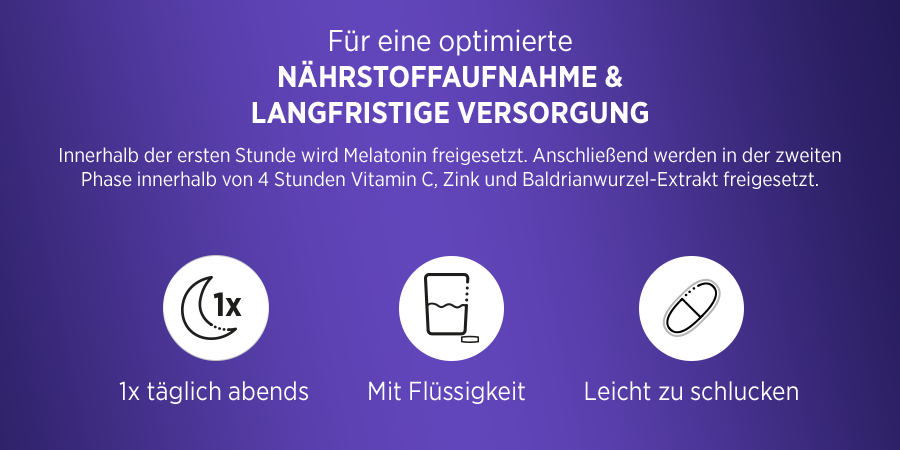 Nehme eine Tablette täglich abends kurz vor dem Schlafengehen mit Flüssigkeit ein, um die nächtliche Regenerationsphase Deines Körpers optimal zu unterstützen.