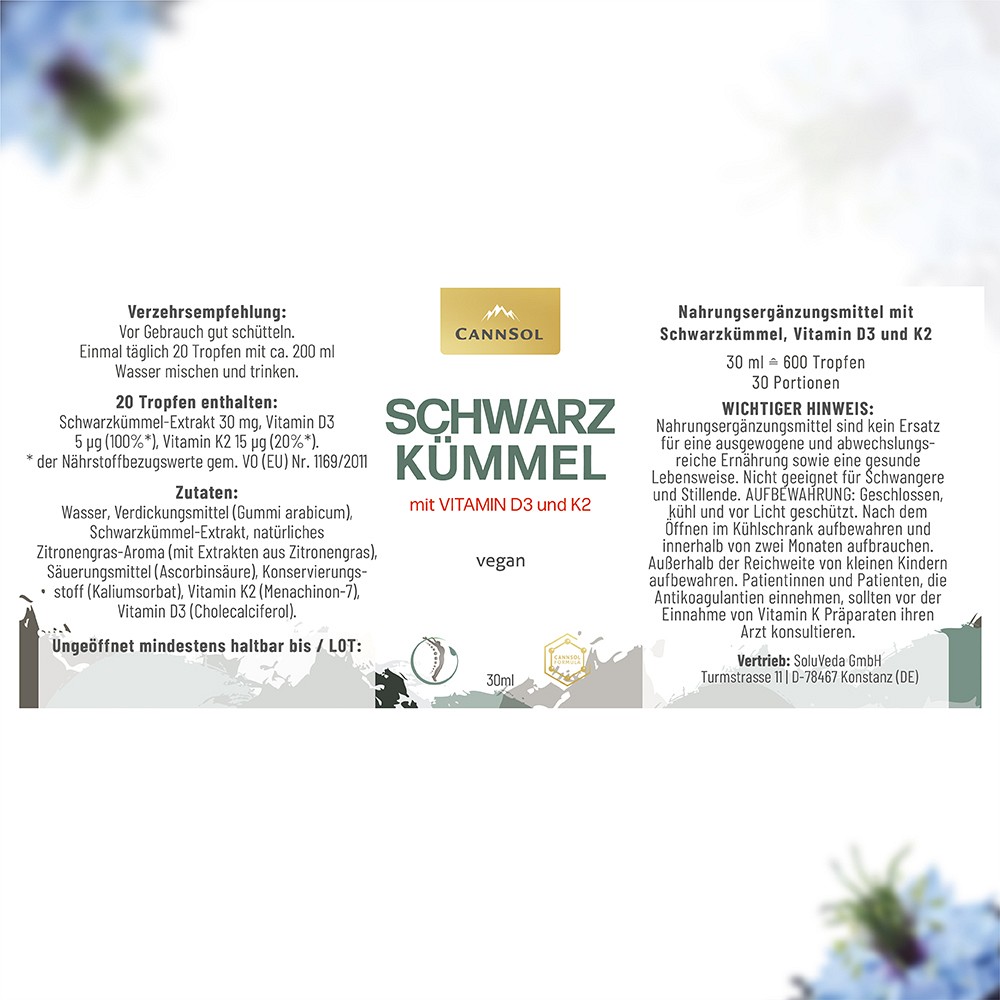 CannSol vereint die natürliche Kraft des Schwarzkümmels mit den Nährstoffen Vitamin D3 und K2. Schwarzkümmel ist eine Pflanze, die ursprünglich aus dem Nahen Osten stammt und seit Jahrhunderten in der traditionellen Medizin verwendet wird.