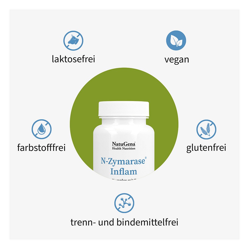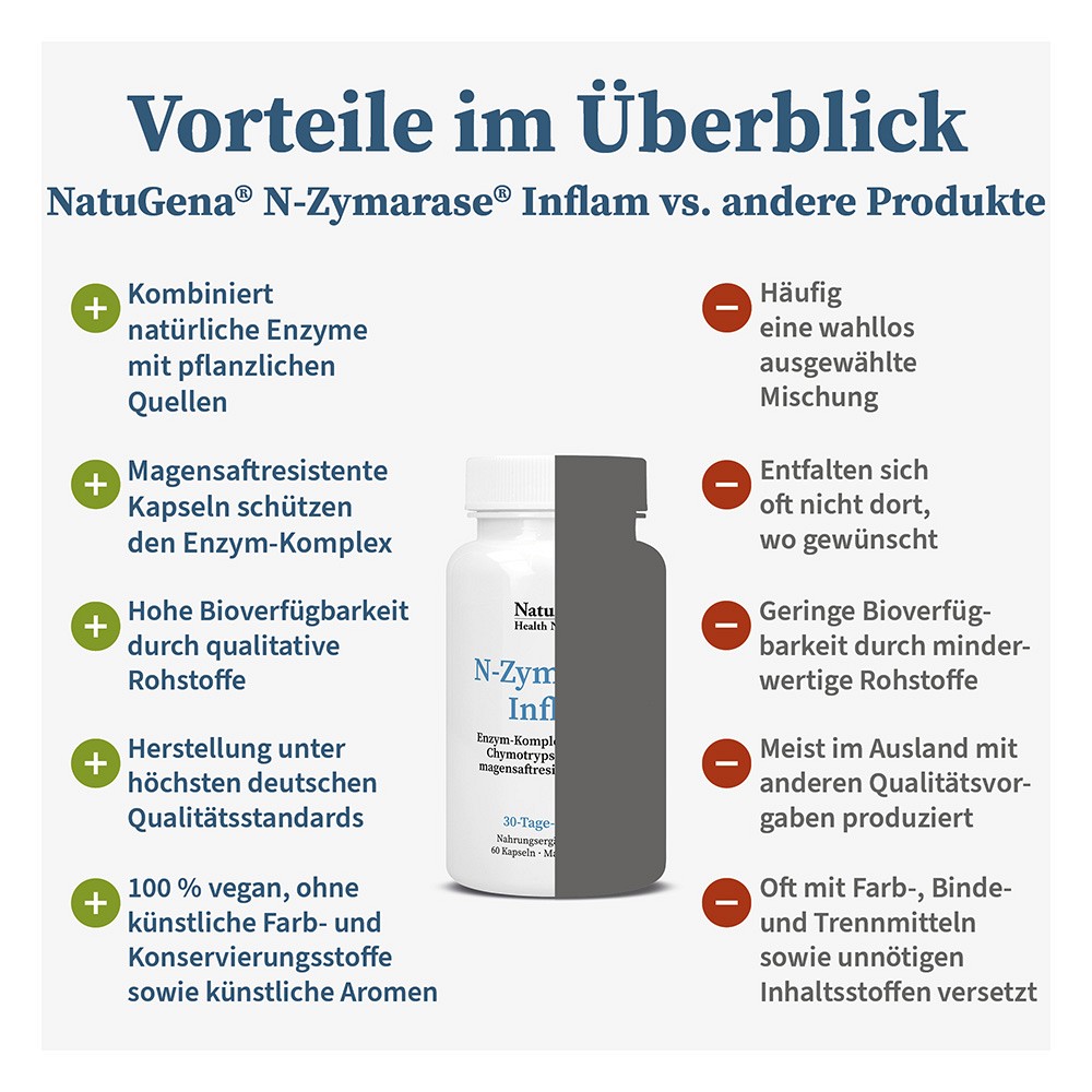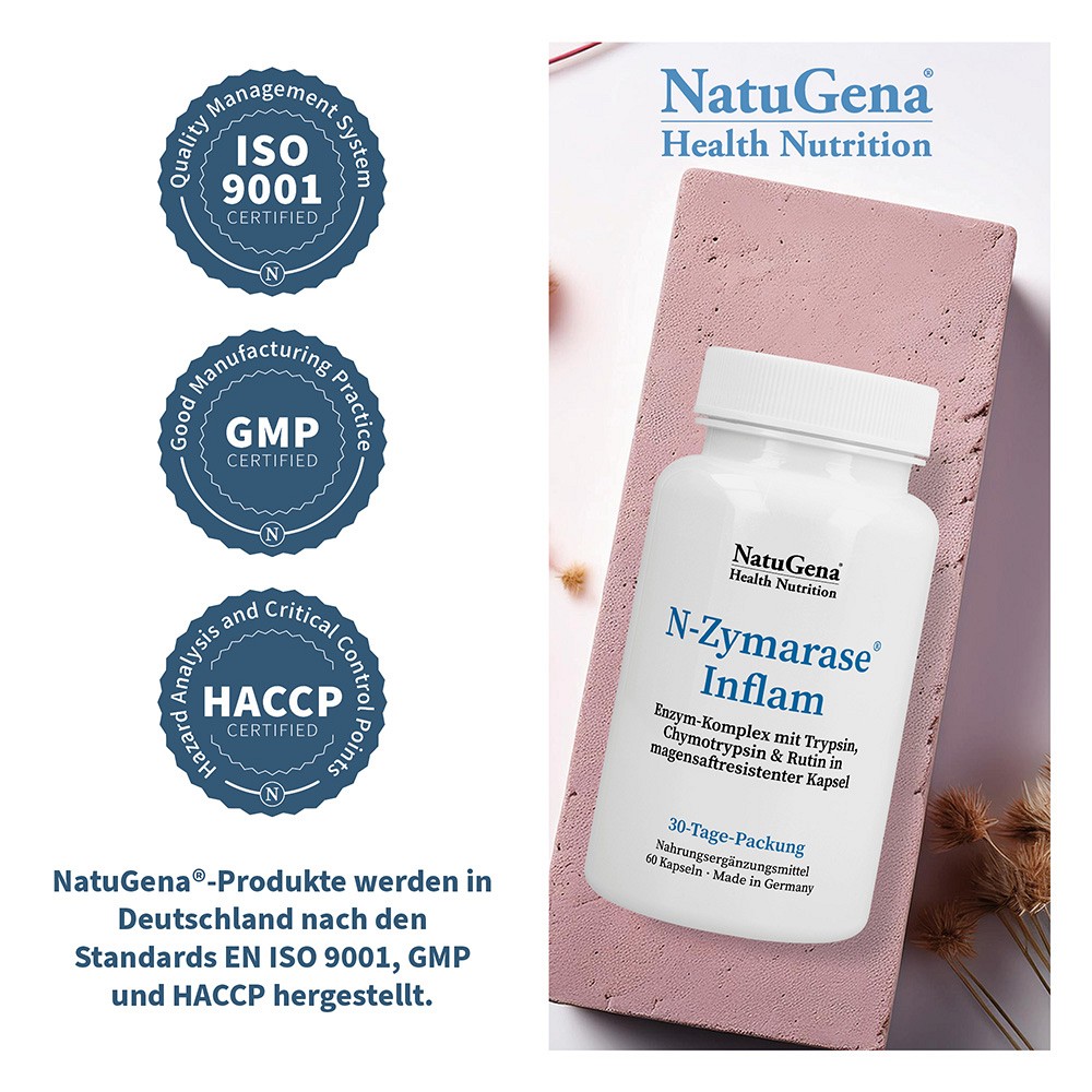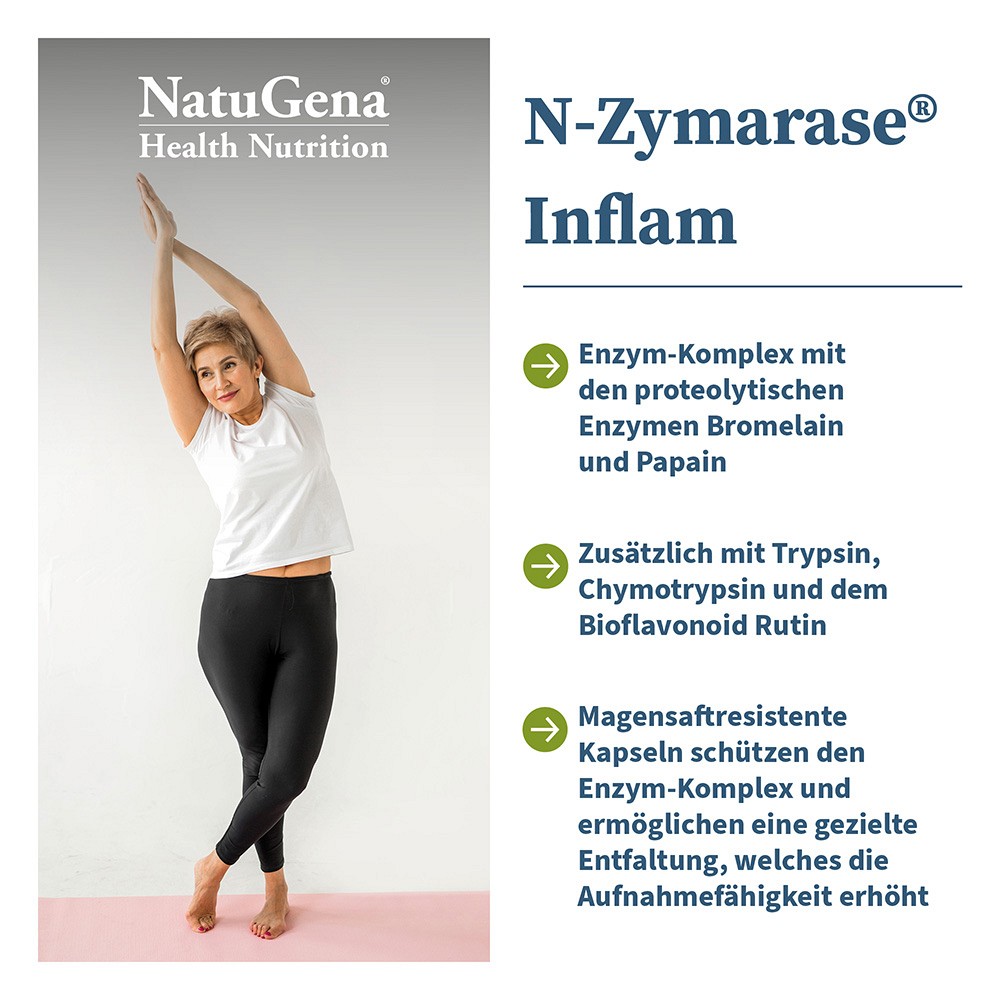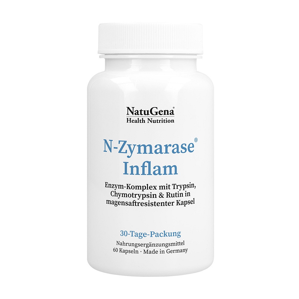 N-Zymarase Inflam ist ein einzigartiger Enzym-Komplex, der hochwertige Enzyme und Pflanzenextrakte in einer speziellen magensaftresistenten Kapsel vereint. Der Komplex enthält Trypsin und Chymotrypsin sowie das Flavonoid Rutin, ergänzt durch Bromelain und Papain.