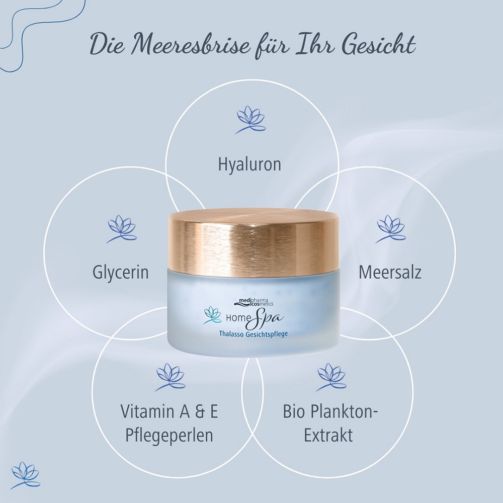 Tauchen Sie ein in die erfrischende Welt der Home Spa Thalasso Gesichtspflege von medipharma cosmetics und genießen Sie die beruhigende Wirkung des Meeres auf der Haut.