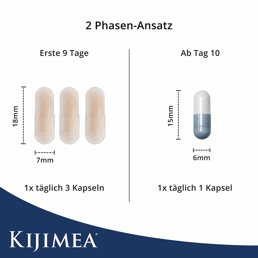 Kijimea Complete ist eine einzigartige Kombination aus Kijimea Restart und Kijimea K53 Advance. Über 3 Monate hinweg ermöglicht diese besondere Kombination einen innovativen 2-Phasen Ansatz: In den ersten 9 Tagen führen Sie mit Kijimea Restart die einzigartig hohe Dosierung von 150 Milliarden KBE je Tag zu. Dadurch bekommt der Darm einen besonders starken "Mikrokulturen-Impuls".Darauf aufbauend folgt Phase 2 für weitere 84 Tage. Hier kommt Kijimea K53 Advance zum Einsatz, welches für den Verzehr über einen längeren Zeitraum konzipiert ist. In dieser Phase werden mindestens 21 Milliarden Mikrokulturen pro Tag zugeführt.