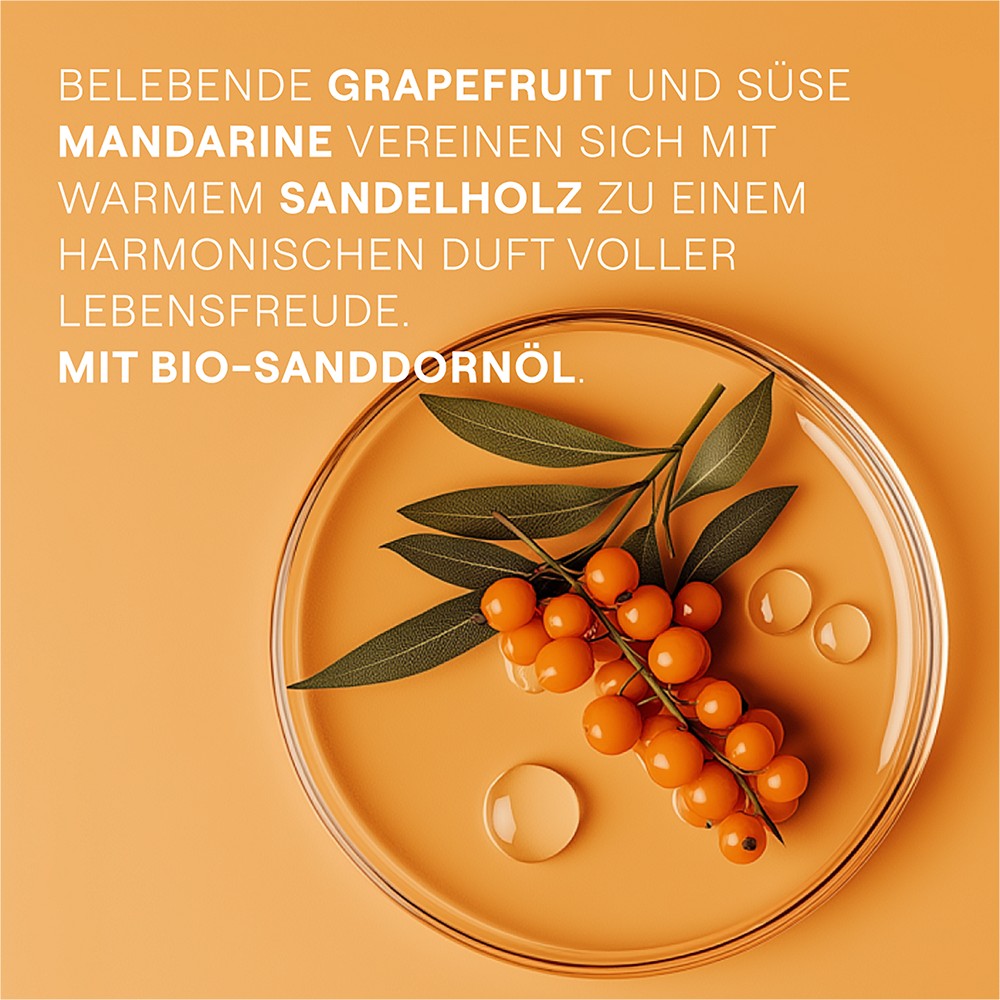 Anregender Duft, der deine Sinne belebt. Kostbares Sanddornöl und der 100% natürliche Duft von Grapefruit und Mandarine schenken dir ein Gefühl von Lebensfreude.87% stimmten zu: Das Produkt pflegt die Haut sofort nach der ersten Anwendung.*