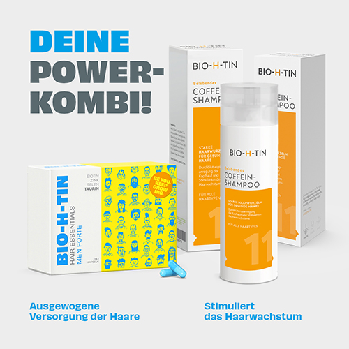 Dann kombiniere Bio-H-Tin Hair Essentials Men Forte mit dem Bio-H-Tin Coffein Shampoo!