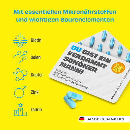 | ⦁ Speziell entwickelt für Männerhaare mit Biotin, Zink, Selen und Taurin ⦁ Nur 1 Kapsel täglich für kraftvolles, vitales Haar ⦁ 100% vegan und laktosefrei ⦁ Made in Bamberg |