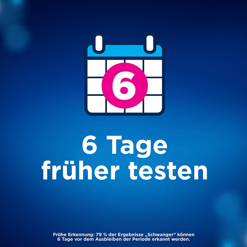 Verwenden Sie den Clearblue Schwangerschaftstest Frühe Erkennung für Ergebnisse bis zu 6 Tage vor Ausbleiben der Periode (5 Tage vor dem Fälligkeitstag Ihrer Periode)(1). Clearblue Frühe Erkennung ist unser empfindlichster Schwangerschaftstest (10 mIU/ml) – mit keinem anderen Test können Sie früher testen.