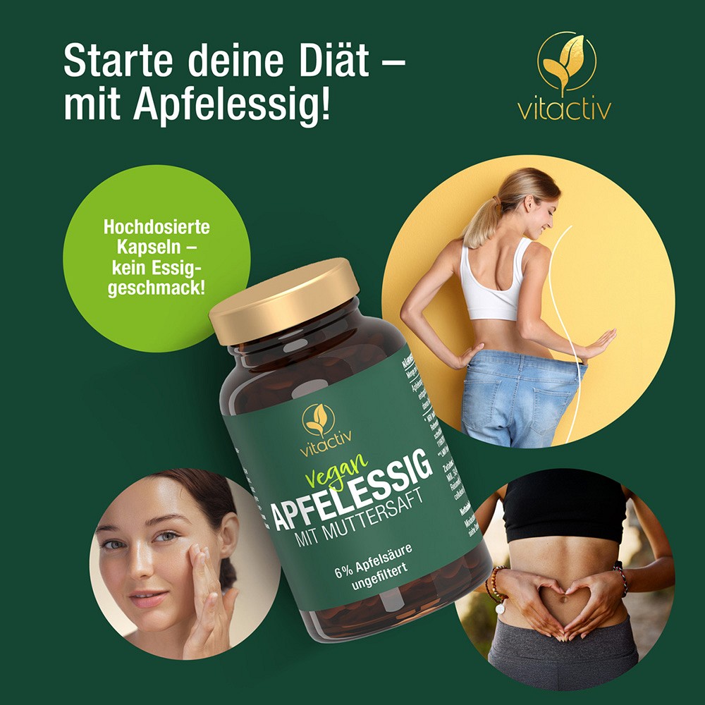 Die Pfunde purzeln lassen und ein angenehm aufgeräumtes Bauchgefühl nach dem Essen. Die APFELESSIG Kapseln von Vitactiv bieten dir die bewährte Wirkung von Apfelessig in praktischer und hochdosierter Form – ideal für die Unterstützung beim Abnehmen, für eine gesunde Verdauung und ein schönes Hautbild.