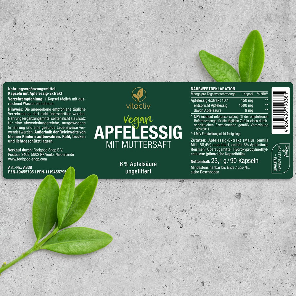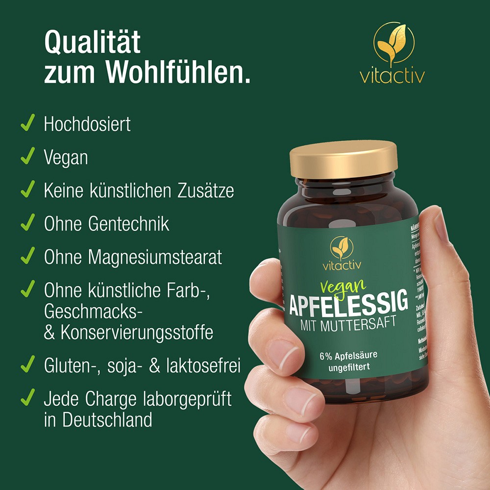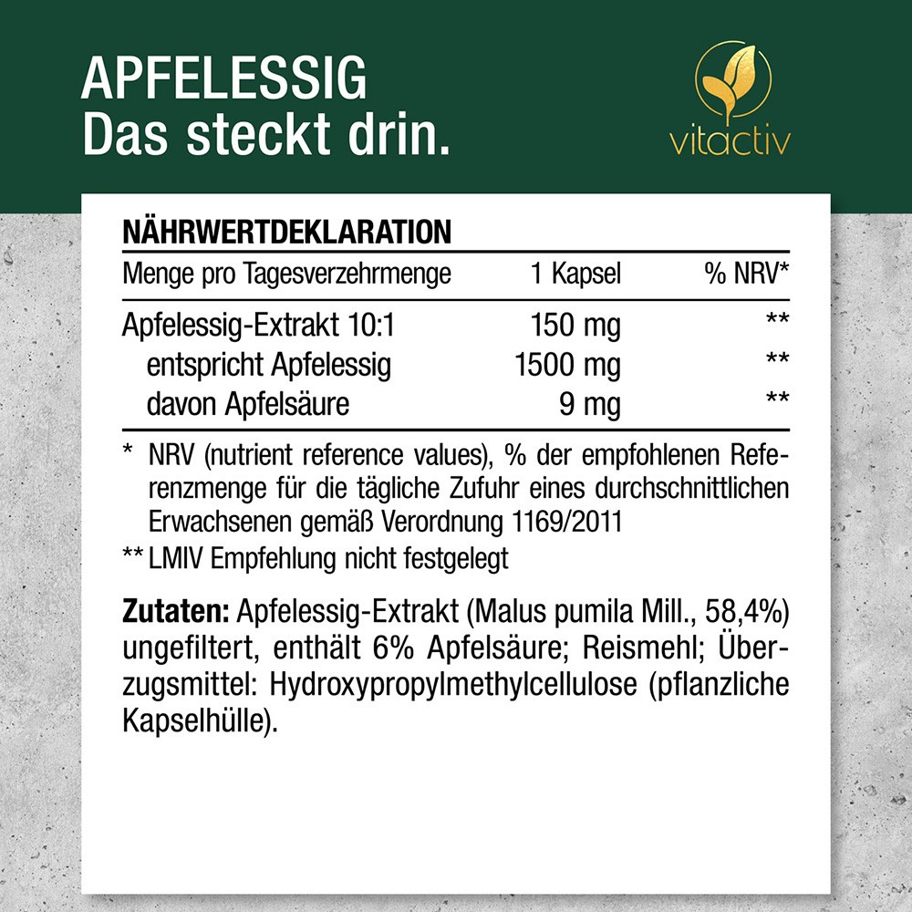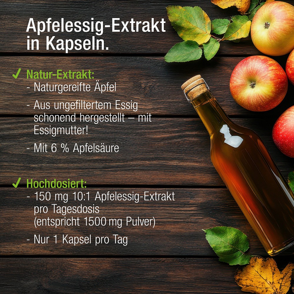 • Apfelessig Kapseln hochdosiert: 150 mg hochkonzentrierter Apfelessig Extrakt (10:1) pro Kapsel