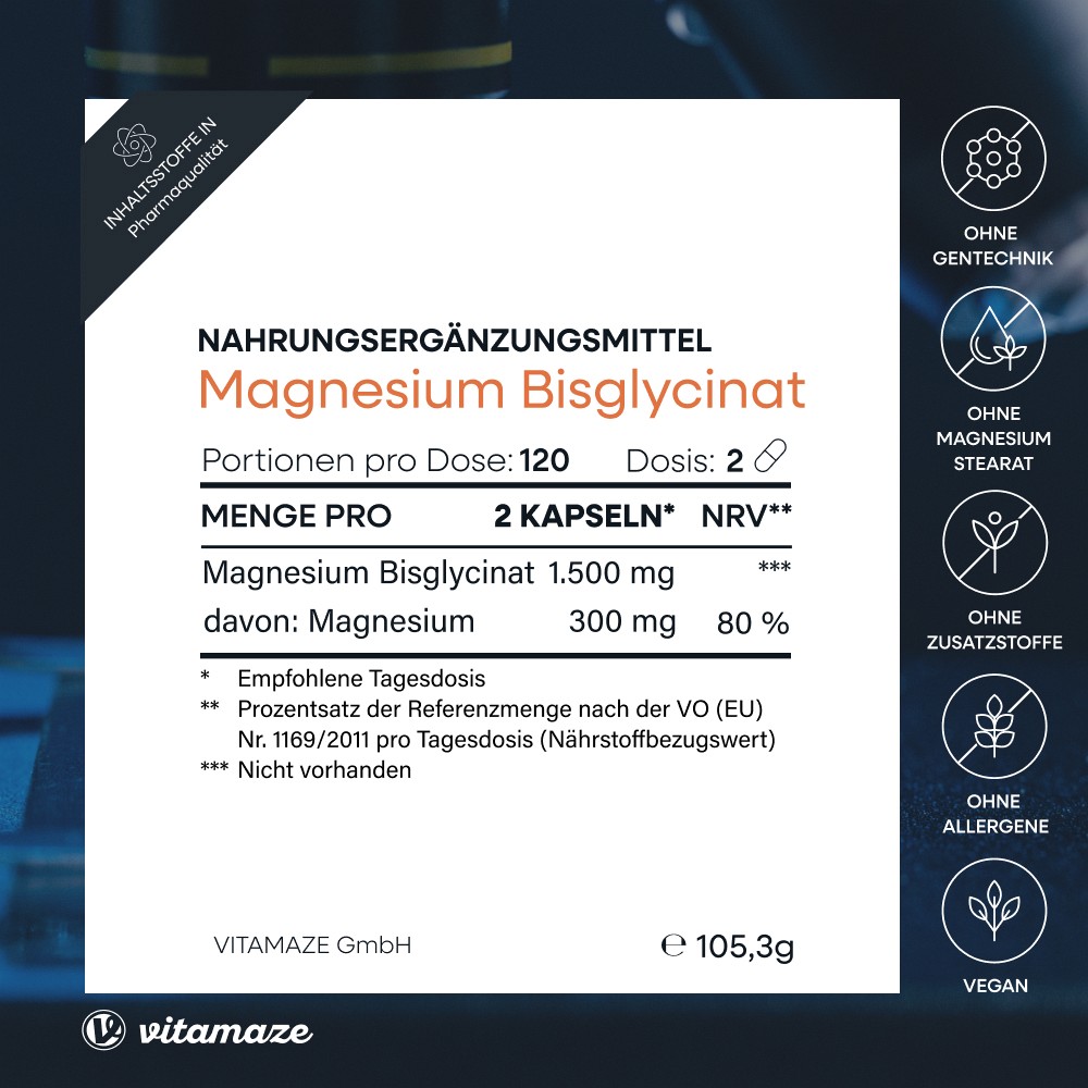 Mit 300 mg elementarem Magnesium pro Tagesdosis (1.500 mg Magnesiumbisglycinat) in nur zwei Kapseln täglich, wird der Körper optimal mit 80% des Referenzwerts fur Nährstoffe (Nutrition Reference Values/NRV) für Magnesium versorgt.120 vegane Kapseln sind ausreichend für 2 Monate und bieten durch die Verwendung von Magnesiumbisglycinat ein Magnesium in einer hoch bioverfügbaren und besonders gut verträglichen Form (magen- und darmschonend).