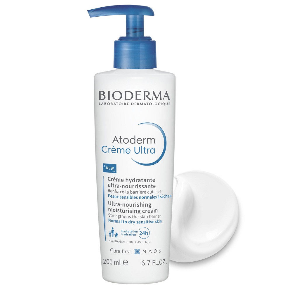 Die feuchtigkeitsspendende, nährende Körpercreme Atoderm Crème Ultra von BIODERMA versorgt die normale bis trockene empfindliche Haut für 24h Feuchtigkeit(1). Die Creme ist geeignet für die Gesichts- und Körperhaut der ganzen Familie (außer Frühgeborene).Dank der geschmeidigen, cremigen Textur zieht Atoderm Crème Ultra schnell ein. Die Formulierung respektiert die Biologie der Haut und bringt sie nachhaltig in ihr natürliches Gleichgewicht zurück. Unparfümiert.