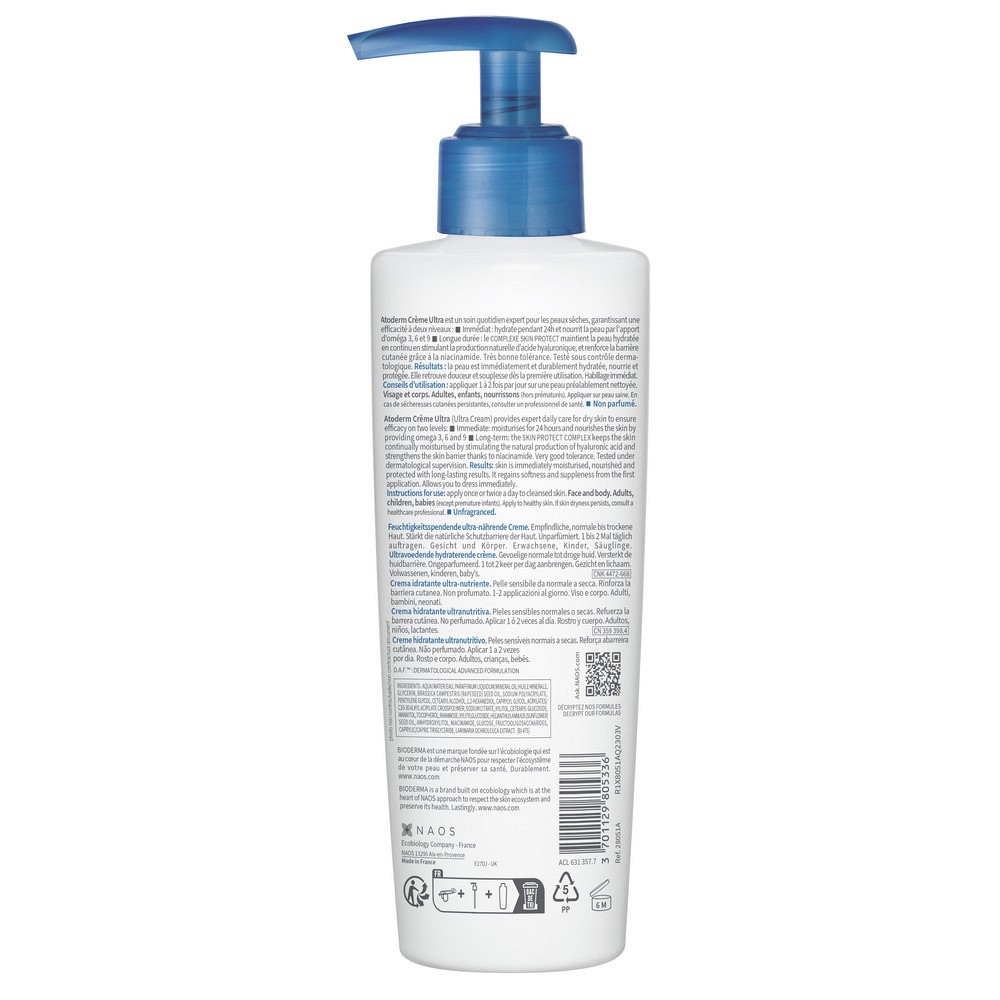 Die Haut wird genährt dank der enthaltenen biomimetischen Lipide Omega 3, 6 und 9. Enthaltene Feuchthaltemittel speichern Feuchtigkeit in der Haut. Atoderm Crème Ultra enthält wie alle BIODERMA Produkte 9-fach gereinigtes Wasser, welches dem Zellwasser in unseren Hautzellen sehr ähnlich und somit höchst verträglich ist.Der SKIN PROTECT Complex, der aus Vitamin B3 (Niacinamid) und Xylitylglucoside besteht, stellt die gesunde Hautbarriere auf physischer und biologischer Ebene wieder her und hilft, die Wasserreserven der Haut zu erhalten, so dass sich die Haut wieder angenehm anfühlt: Vitamin B3 trägt durch die Stimulierung der Lipidsynthese zur Restrukturierung der Hautbarriere bei, wodurch die Geschmeidigkeit der Haut verbessert und ihr dauerhaftes Wohlbefinden wiederhergestellt wird.