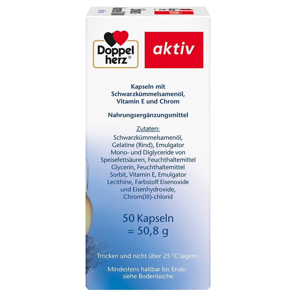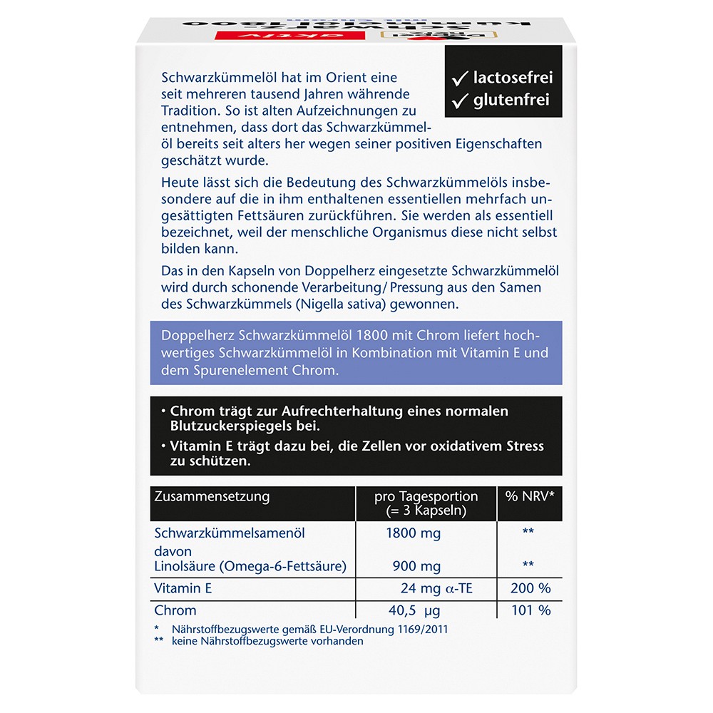 Doppelherz Schwarzkümmelöl 1800 mit Chrom liefert hochwertiges Schwarzkümmelöl in Kombination mit Vitamin E und dem Spurenelement Chrom. Das in den Kapseln von Doppelherz eingesetzte Schwarzkümmelöl wird durch schonende Verarbeitung/ Pressung aus den Samen des Schwarzkümmels (Nigella sativa) gewonnen.