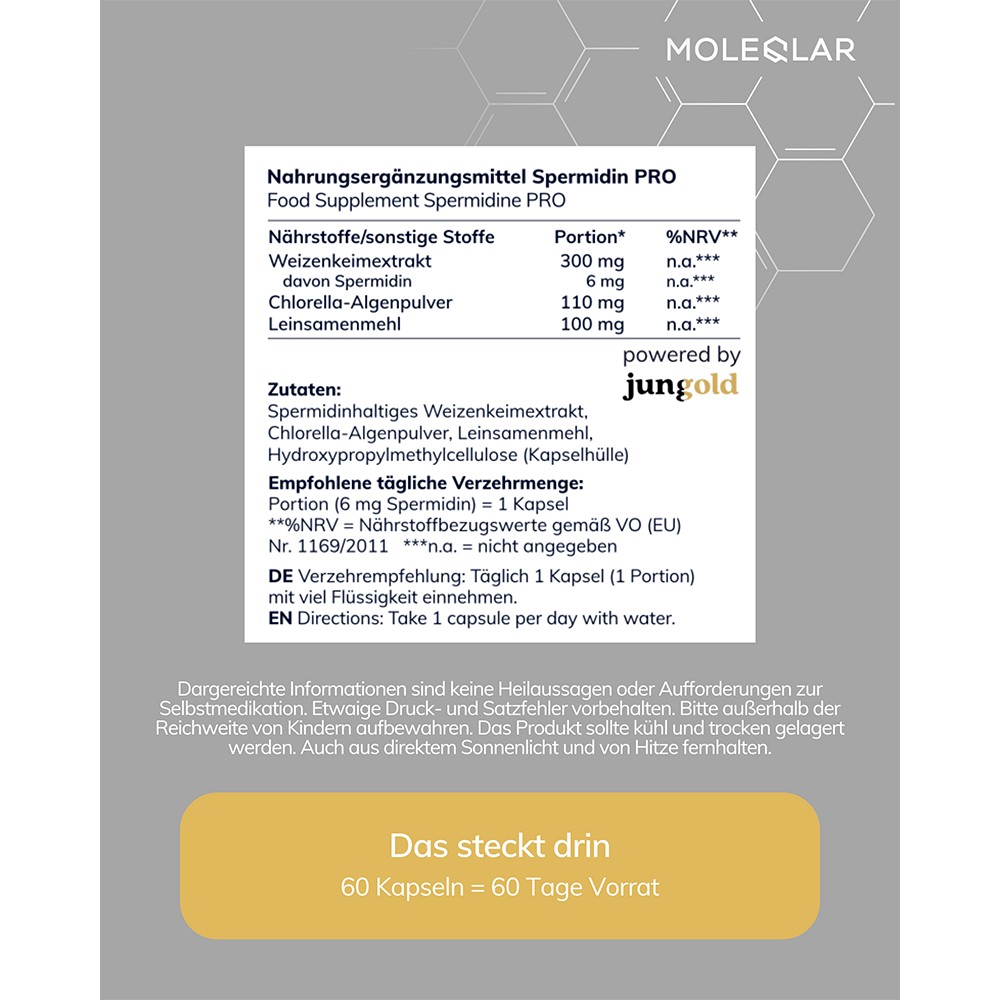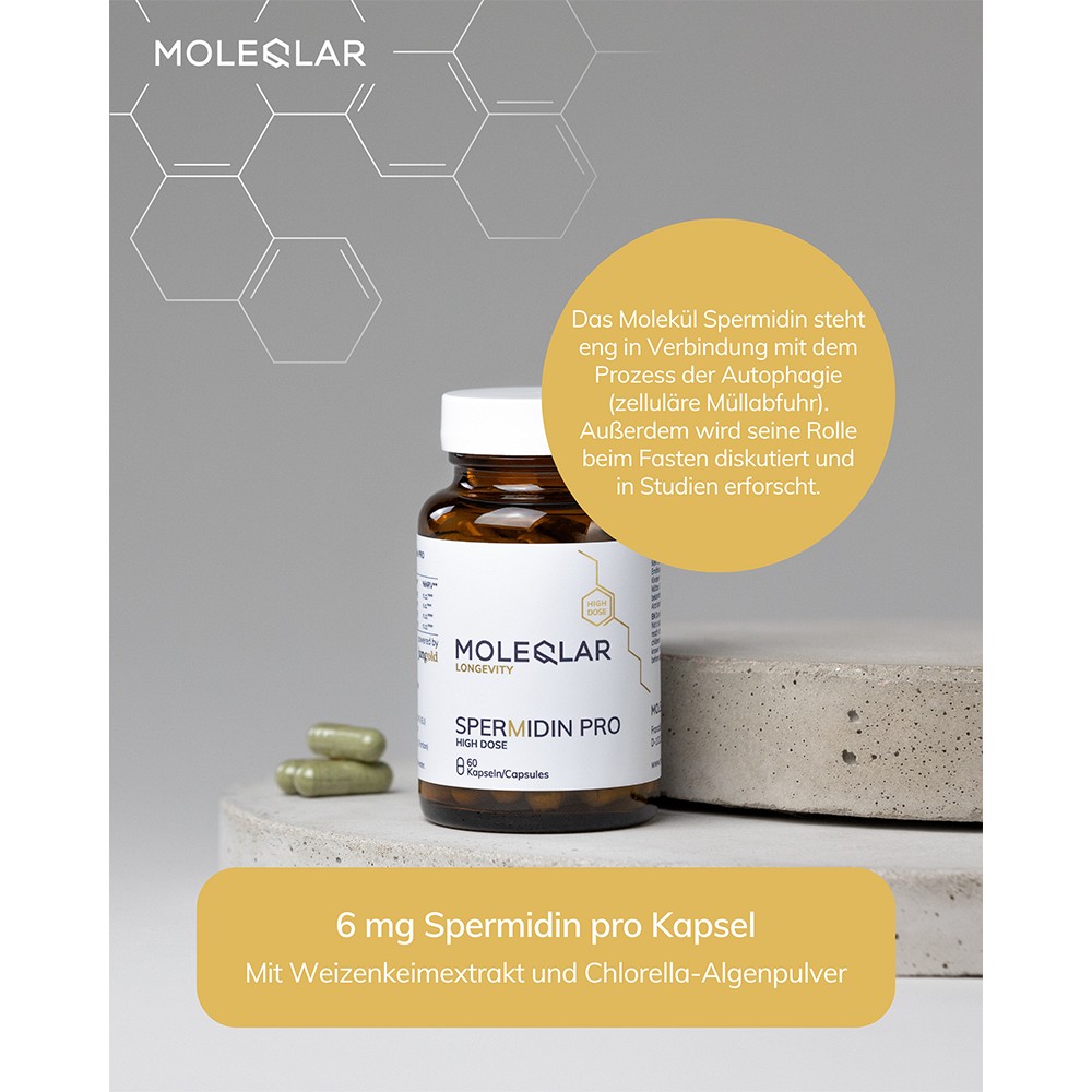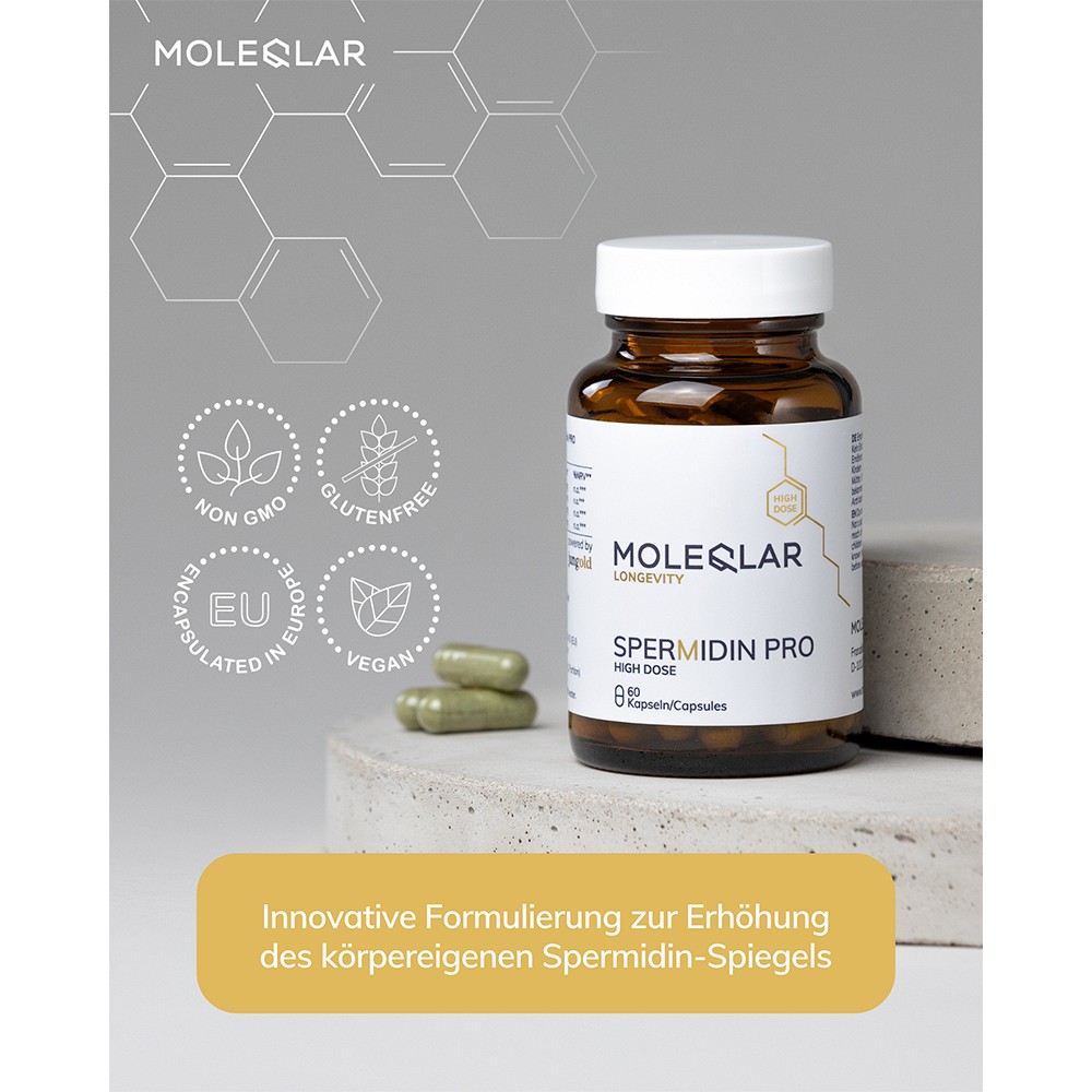 Das hochdosierte Spermidin PRO von MoleQlar bietet 6 mg Spermidin pro Kapsel, gewonnen aus hochwertigen Rohstoffen wie spermidinhaltigem Weizenkeimextrakt und Chlorella-Algenpulver.