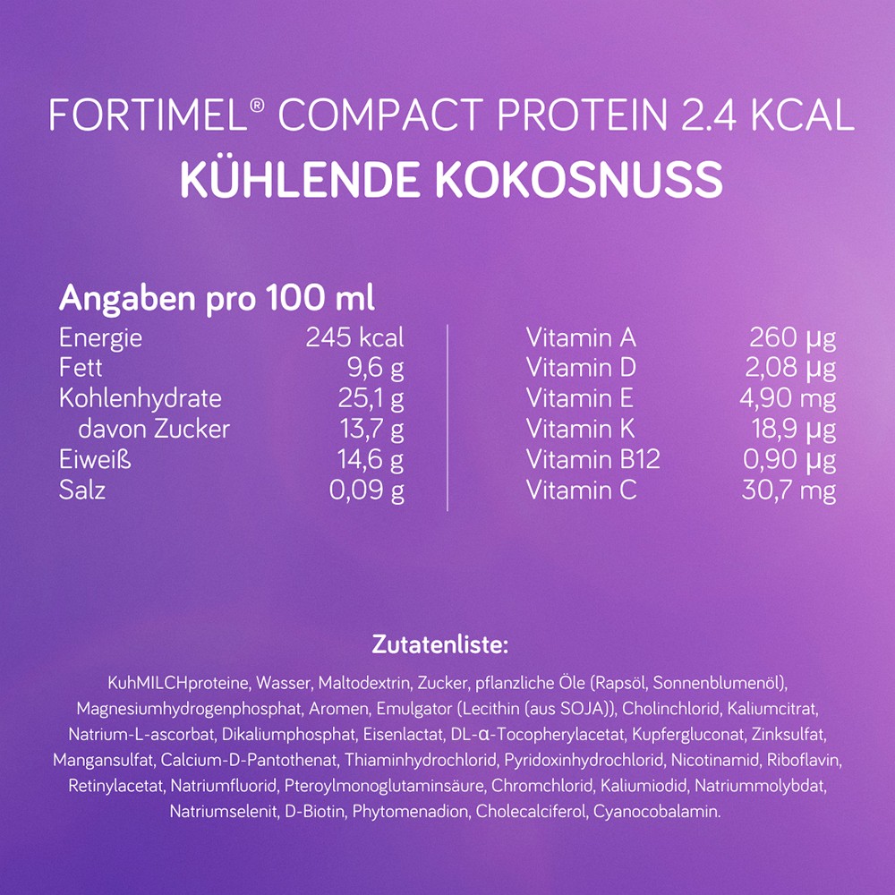 – Hochkalorische und eiweißreiche Trinknahrung mit allen wichtigen Nährstoffen, Vitaminen, Mineralien und Spurenelementen – 32 x 125 mlDie Fortimel Compact Protein Sensations-Sorten kühlende Beere und kühlende Kokosnuss wurden speziell entwickelt für Krebspatient:innen mit Geschmacksveränderungen. Dank der enthaltenen Menthol-Derivate erzeugen die beiden Sorten ein erfrischendes Gefühl im Mund- und Rachenraum.