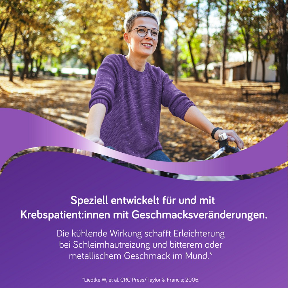 - Die Sensations-Sorten kühlende Kokosnuss und kühlende Beere wurden speziell für Krebspatient:innen mit Geschmacksveränderungen entwickelt / Die kühlende Wirkung schafft Erleichterung bei Schleimhautreizung und bitterem oder metallischem Geschmack im Mund