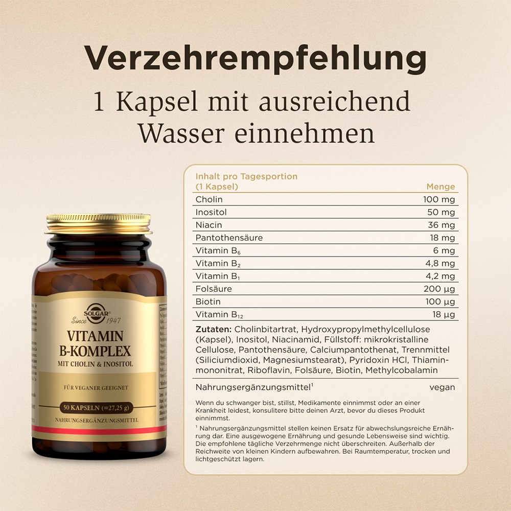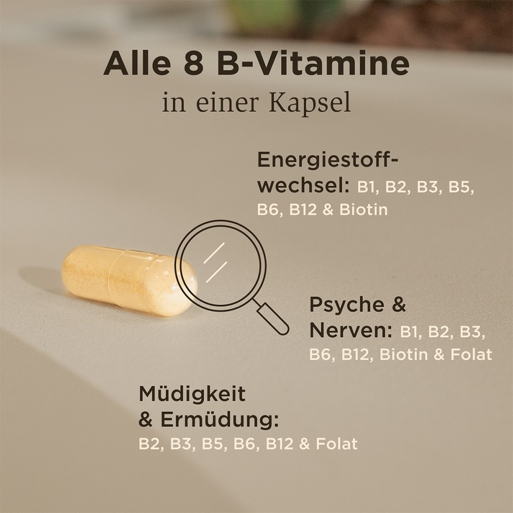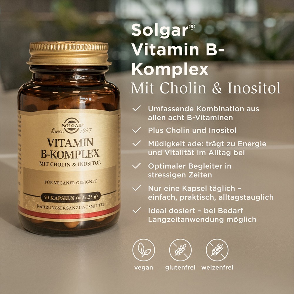 Dieser Komplex vereint alle acht B-Vitamine mit den wertvollen Nähr-stoffen Cholin und Inositol. Die acht B-Vitamine, darunter B1, B2, B6 und B12, unterstützen die normale Funktion des Nervensystems und der Psyche sowie die normale Funktion des Energiestoffwechsels und tragen zur Verringerung von Müdigkeit und Erschöpfung bei.