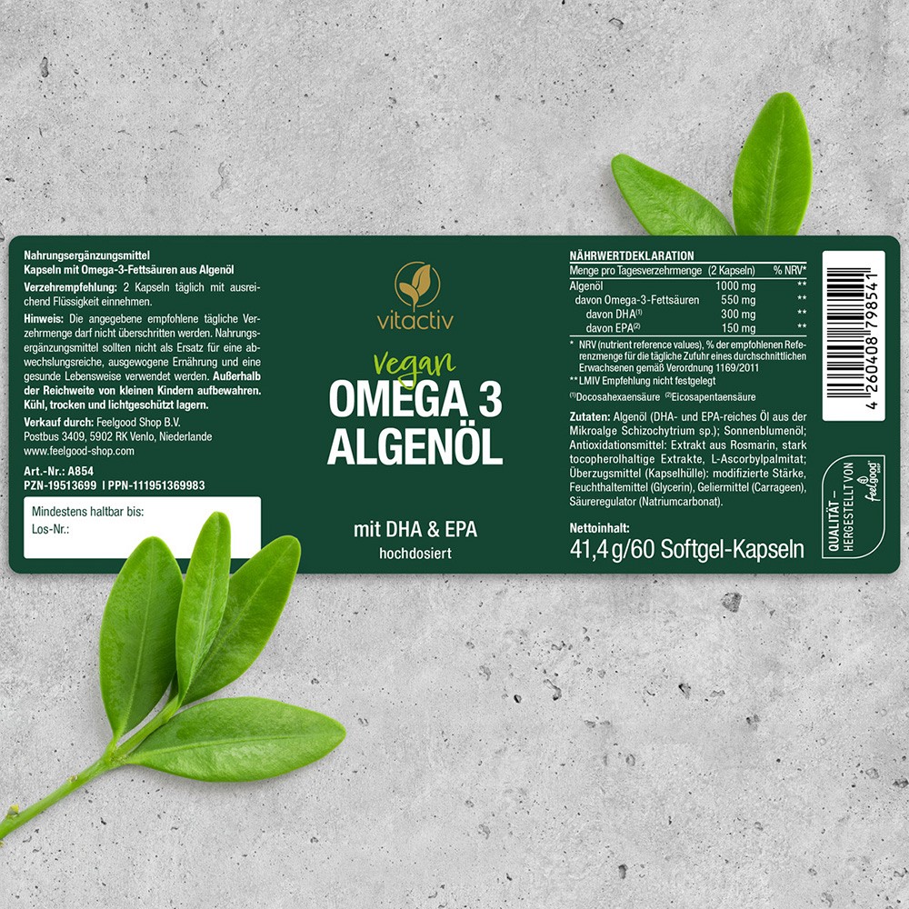 - Vegane Omega-3-Fettsäuren aus hochwertigem Algenöl
