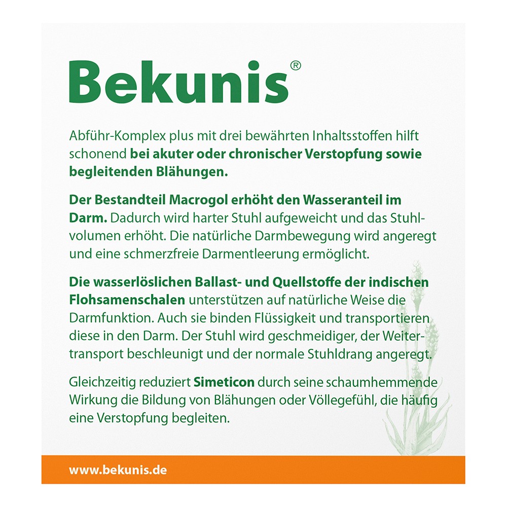 Bekunis Abführ-Komplex plus enthält den Wirkstoff Macrogol, der gezielt den Wasseranteil im Darm erhöht. Dadurch wird harter Stuhlaufgeweicht, das Stuhlvolumen vergrößert und die natürliche Darmbewegung sanft angeregt. Ergänzend unterstützen die wasserlöslichen Ballast- und Quellstoffe der indischen Flohsamenschalen auf natürliche Weise die Darmfunktion. Sie binden Flüssigkeit und fördern den Weitertransport des Stuhls.Der schaumhemmende Inhaltsstoff Simeticon hilft, Blähungen und Druckgefühle im Bauch zu reduzieren, die häufig in Verbindung mit Verstopfung auftreten.