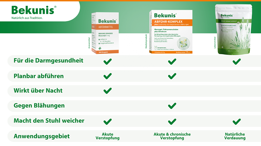 Seit Jahrzehnten steht Bekunis für bewährte pflanzliche Unterstützung bei Verdauungsproblemen – zuverlässig, gut verträglich und an den individuellen Bedarf angepasst.Ob planbare Hilfe über Nacht mit den Bekunis Dragées, eine besonders sanfte Lösung bei akuter oder chronischer Verstopfung mit dem Bekunis Abführ-Komplex Plus oder eine ballaststoffreiche Darmregulierung durch Bekunis Flohsamenschalen: