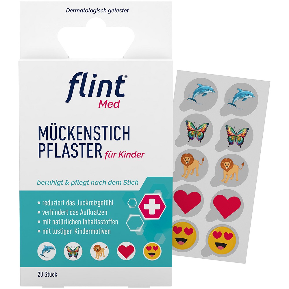 Seit über 30 Jahren steht flint Med für bewährte Qualität in der Wundversorgung.Die flint Med Mückenstich Pflaster wurden speziell für Kinder entwickelt, um Mückenstiche sanft zu beruhigen und empfindliche Haut vor zusätzlicher Reizung zu schützen. Dank der natürlichen Inhaltsstoffe werden die Stiche spürbar gelindert, während das Pflaster als Schutzschild wirkt und verhindert, dass Kinder die betroffene Stelle aufkratzen.