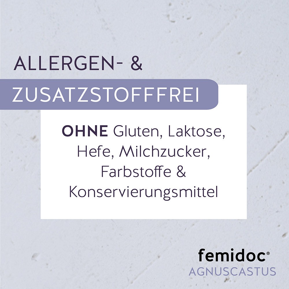 femidoc AGNUS CASTUS enthält einen alkoholfreien Mönchspfeffer (Keuschlammfrüchte) Extrakt. femidoc ist ein hormonfreies Naturstoffpräparat. Die Inhaltsstoffe werden aus den Früchten des Mönchspfeffers, auch Keuschlamm genannt, gewonnen. Mönchspfeffer (Agnus-castus L.) hilft während des prämenstruellen Zyklus.