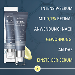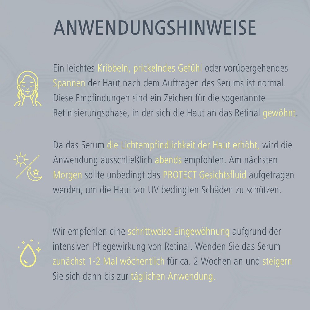 Da das Retinal Serum die Lichtempfindlichkeit der Haut erhöhen kann, wird die Anwendung ausschließlich abends empfohlen.