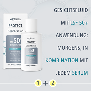 Da die Seren die Lichtempfindlichkeit der Haut erhöhen können, wird die Anwendung ausschließlich abends empfohlen. Am nächsten Morgen sollte unbedingt das PROTECT Gesichtsfluid LSF 50+ aufgetragen werden, um die Haut vor UV-bedingten Schäden zu schützen. Das Fluid pflegt und beruhigt die Haut zusätzlich.