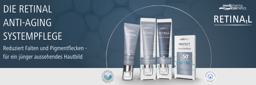 Die neuen Retinal Seren von medipharma cosmetics unterstützen die Zellerneuerung und helfen, die Hautpigmentierung zu regulieren – für ein ebenmäßigeres Hautbild. Zudem schützt das Gesichtsfluid mit LSF 50+ vor UV-bedingten Schäden und ist die ideale Ergänzung zu den Retinal Seren.